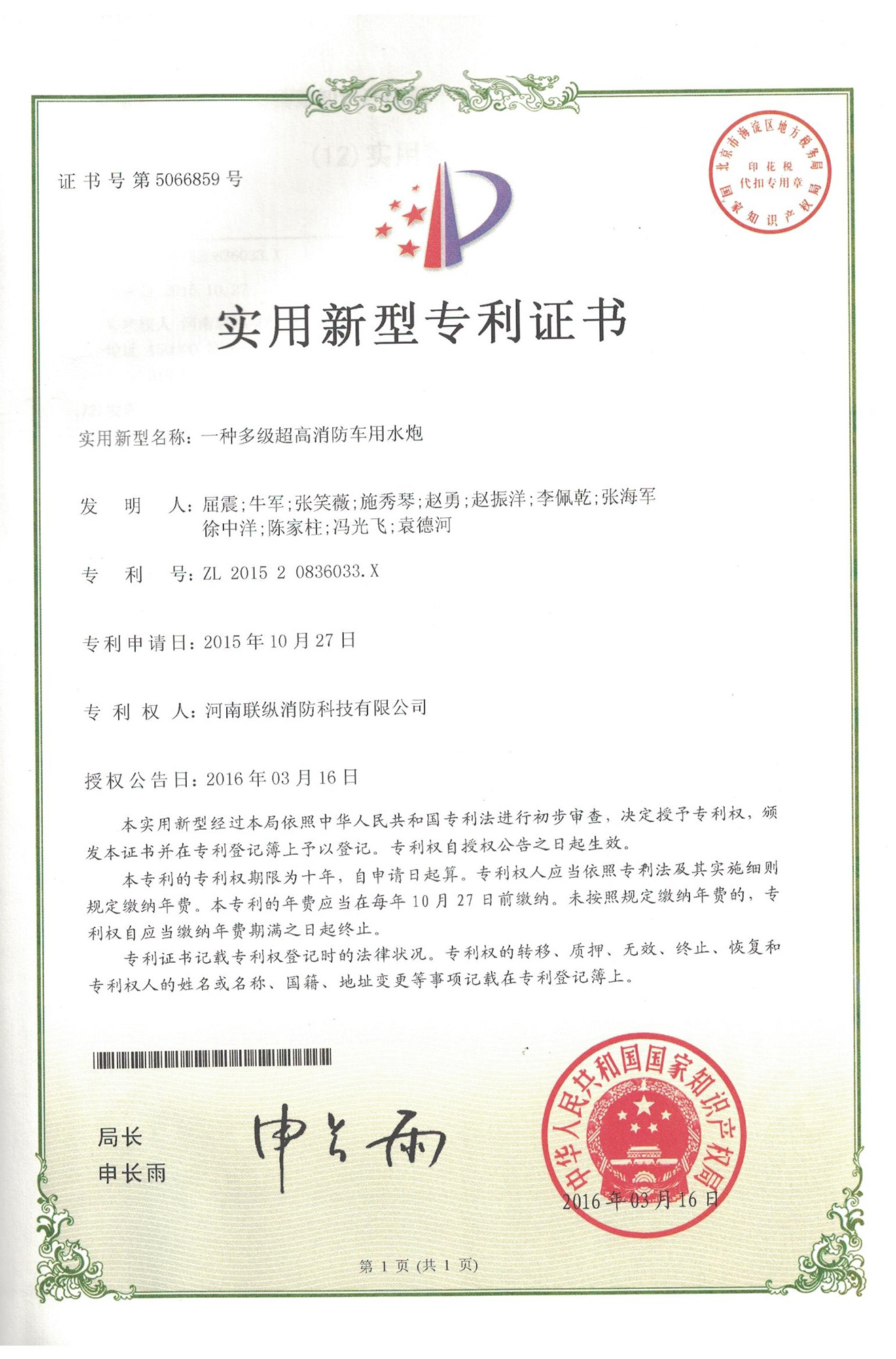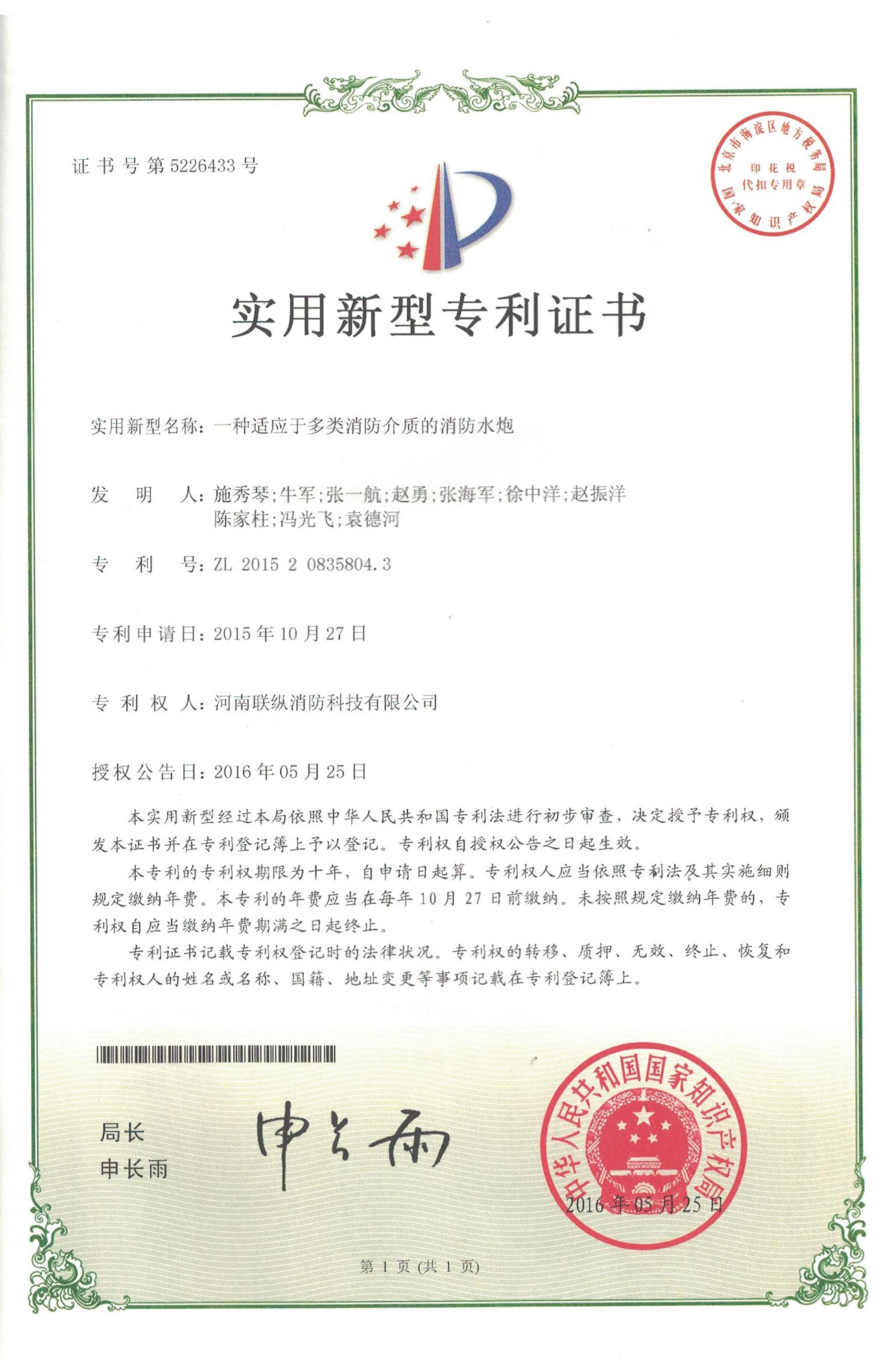 聯(lián)縱消防 專利證書